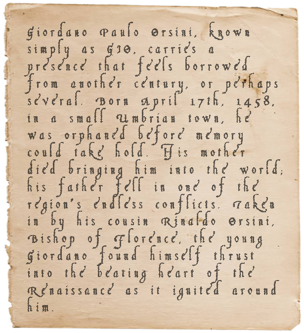 Giordano Paulo Orsini, known simply as GIO, carries a presence that feels borrowed from another century, or perhaps several. Born April 17th, 1458, in a small Umbrian town, he was orphaned before memory could take hold. His mother died bringing him into the world; his father fell in one of the region’s endless conflicts. Taken in by his cousin Rinaldo Orsini, Bishop of Florence, the young Giordano found himself thrust into the beating heart of the Renaissance as it ignited around him.