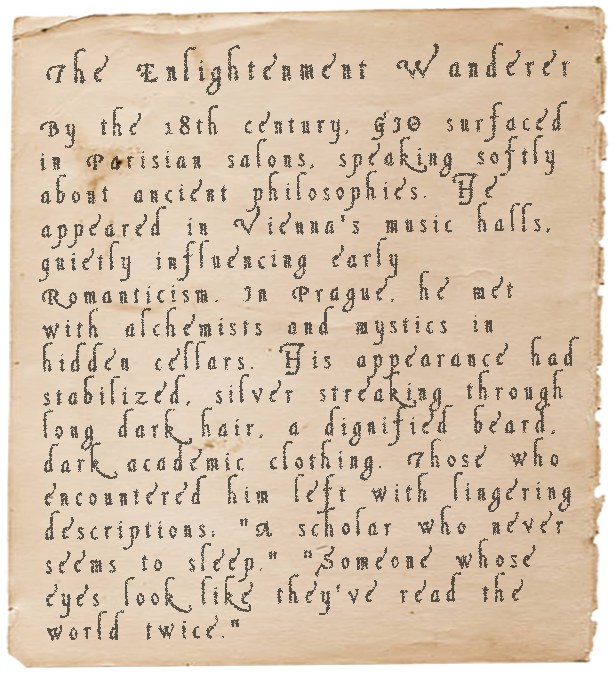 By the 18th century, GIO surfaced in Parisian salons, speaking softly about ancient philosophies. He appeared in Vienna’s music halls, quietly influencing early Romanticism. In Prague, he met with alchemists and mystics in hidden cellars. His appearance had stabilized, silver streaking through long dark hair, a dignified beard, dark academic clothing. Those who encountered him left with lingering descriptions: “A scholar who never seems to sleep.” “Someone whose eyes look like they’ve read the world twice.”