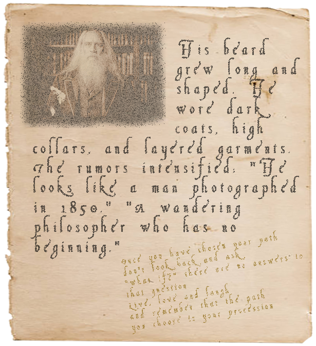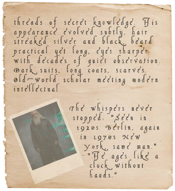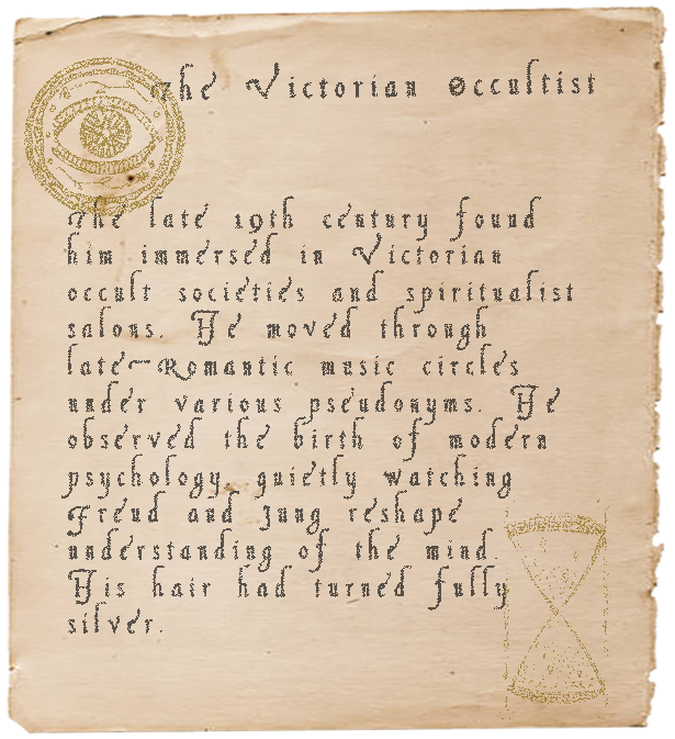 The late 19th century found him immersed in Victorian occult societies and spiritualist salons. He moved through late-Romantic music circles under various pseudonyms. He observed the birth of modern psychology, quietly watching Freud and Jung reshape understanding of the mind. His hair had turned fully silver. His beard grew long and shaped. He wore dark coats, high collars, and layered garments. The rumors intensified: “He looks like a man photographed in 1850.” “A wandering philosopher who has no beginning.”
