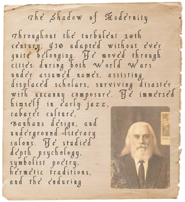 Throughout the turbulent 20th century, GIO adapted without ever quite belonging. He moved through cities during both World Wars under assumed names, assisting displaced scholars, surviving disaster with uncanny composure. He immersed himself in early jazz, cabaret culture, Bauhaus design, and underground literary salons. He studied depth psychology, symbolist poetry, hermetic traditions, and the enduring threads of secret knowledge. His appearance evolved subtly, hair streaked silver and black, beard practical yet long, eyes sharper with decades of quiet observation. Dark suits, long coats, scarves. Old-world scholar meeting modern intellectual.