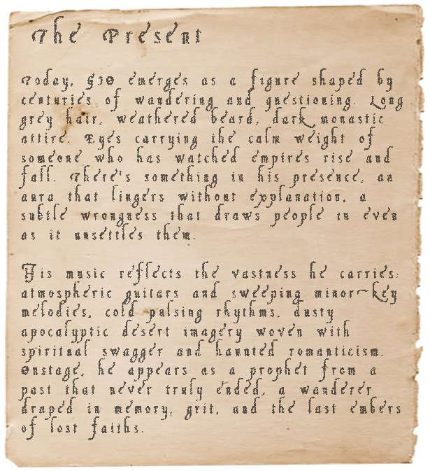 Today, GIO emerges as a figure shaped by centuries of wandering and questioning. Long grey hair, weathered beard, dark monastic attire. Eyes carrying the calm weight of someone who has watched empires rise and fall. There’s something in his presence, an aura that lingers without explanation, a subtle wrongness that draws people in even as it unsettles them.