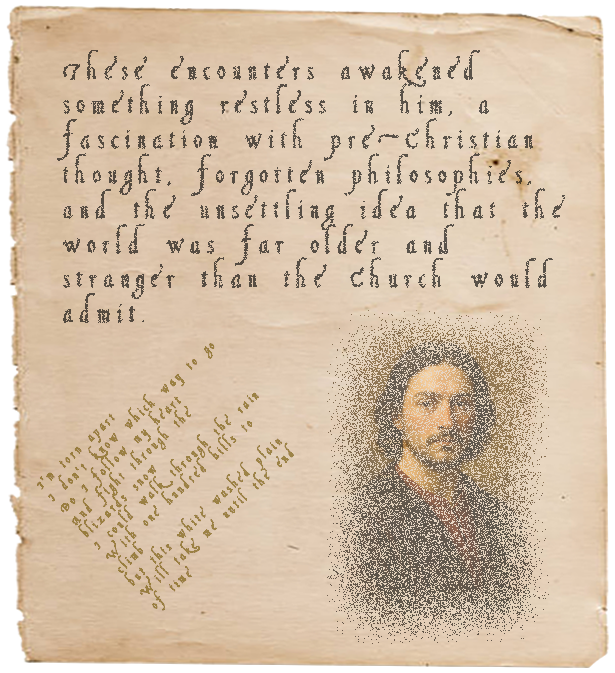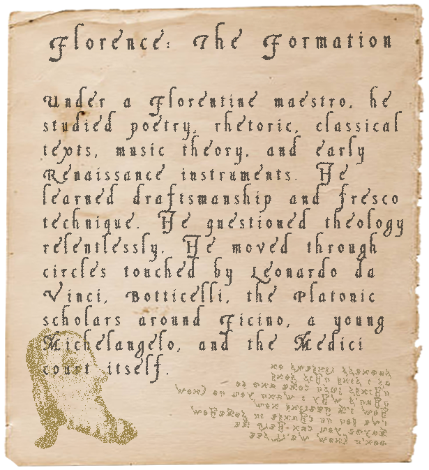 Under a Florentine maestro, he studied poetry, rhetoric, classical texts, music theory, and early Renaissance instruments. He learned draftsmanship and fresco technique. He questioned theology relentlessly. He moved through circles touched by Leonardo da Vinci, Botticelli, the Platonic scholars around Ficino, a young Michelangelo, and the Medici court itself. These encounters awakened something restless in him, a fascination with pre-Christian thought, forgotten philosophies, and the unsettling idea that the world was far older and stranger than the Church would admit.