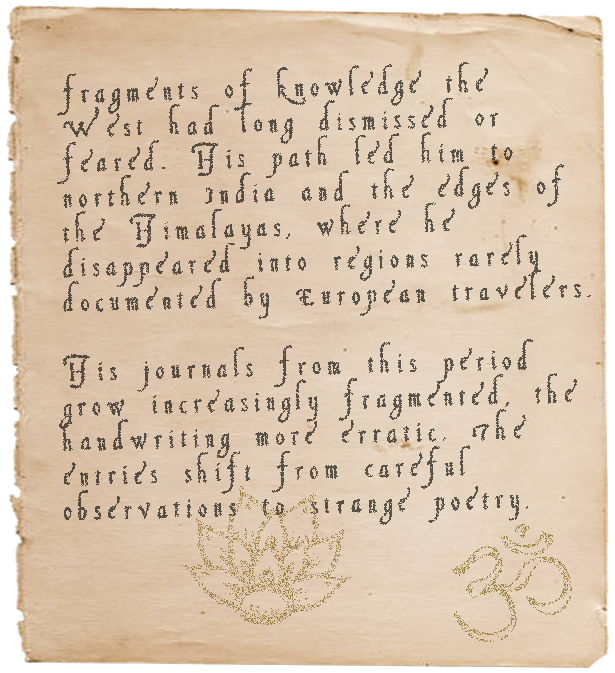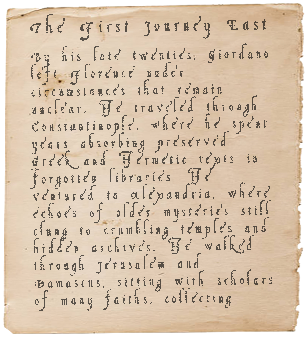 By his late twenties, Giordano left Florence under circumstances that remain unclear. He traveled through Constantinople, where he spent years absorbing preserved Greek and Hermetic texts in forgotten libraries. He ventured to Alexandria, where echoes of older mysteries still clung to crumbling temples and hidden archives. He walked through Jerusalem and Damascus, sitting with scholars of many faiths, collecting fragments of knowledge the West had long dismissed or feared. His path led him to northern India and the edges of the Himalayas, where he disappeared into regions rarely documented by European travelers.