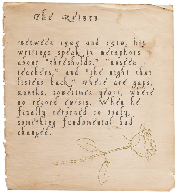 Between 1505 and 1510, his writings speak in metaphors about “thresholds,” “unseen teachers,” and “the night that listens back.” There are gaps, months, sometimes years, where no record exists. When he finally returned to Italy, something fundamental had changed.
