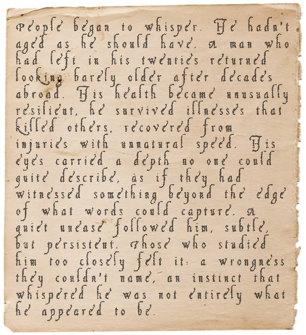 People began to whisper. He hadn’t aged as he should have. A man who had left in his twenties returned looking barely older after decades abroad. His health became unusually resilient, he survived illnesses that killed others, recovered from injuries with unnatural speed. His eyes carried a depth no one could quite describe, as if they had witnessed something beyond the edge of what words could capture. A quiet unease followed him, subtle, but persistent. Those who studied him too closely felt it: a wrongness they couldn’t name, an instinct that whispered he was not entirely what he appeared to be.